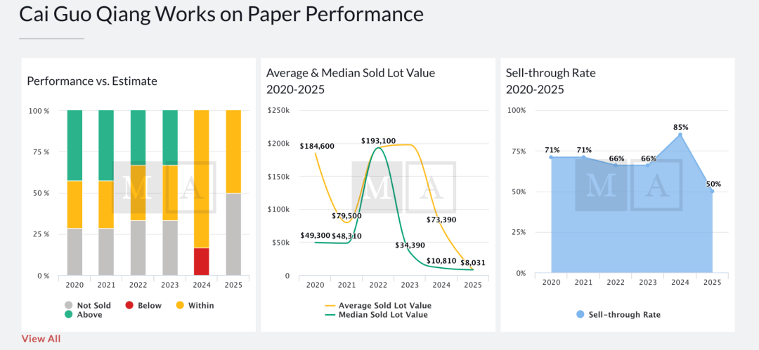 从纸上作品售价表现图表来看,蔡国强作品拍卖价格的高峰在2022-2023年,之后就低于预估价格,甚至在2025年出现将近一半not sold(流拍)作品。