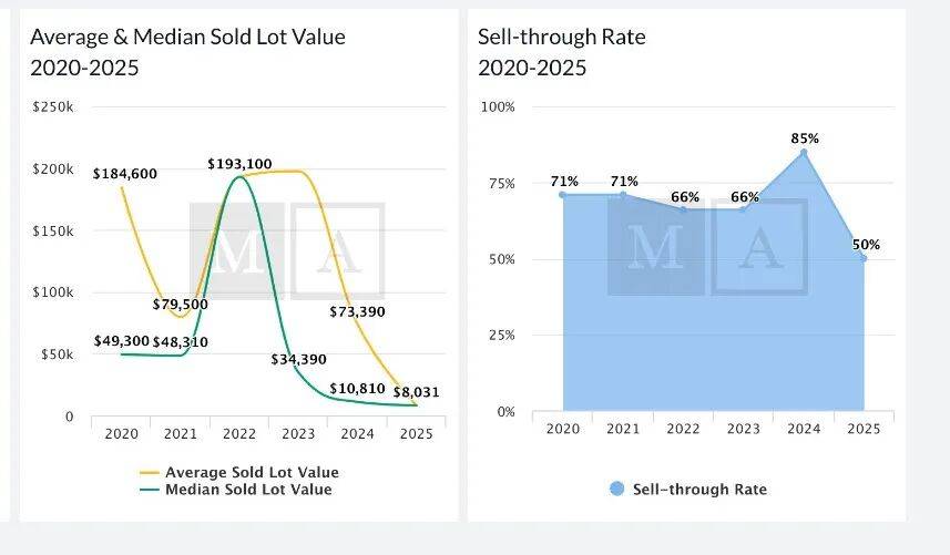更令人心惊的是,到了2025年初,平均成交价竟一度跌破1万美元,成交率(上拍后成功卖出的比例)更是惨遭“膝斩”,一度跌至50%——这意味着,挂出来卖的作品,有一半都无人问津,尴尬地流拍。