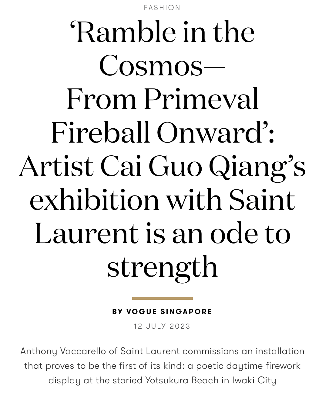 比如圣罗兰(Saint Laurent)曾经赞助蔡国强在日本磐城的四仓海滩(Yotsukura Beach)举办白日焰火,这个海滩邻近福岛第一核电站的位置,经历过核泄露的危机,后对公众重新开放。