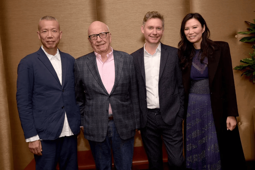 蔡国强、邓文迪、默多克和奥斯卡金像奖最佳纪录片获得者凯文·麦克唐纳。邓文迪最终撮合了凯文·麦克唐纳为蔡国强拍摄纪录片《天梯》。