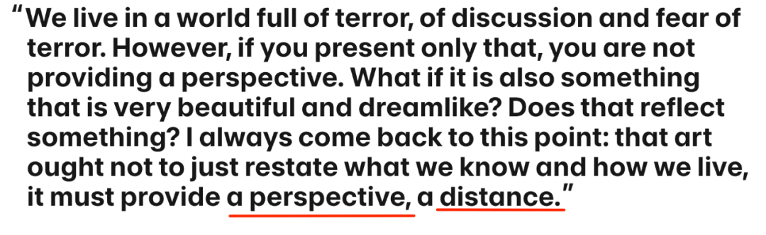原文翻译:“我们生活在一个充满恐怖,以及对恐怖的讨论和恐惧的世界里。然而,如果你只呈现这些,你就没有提供一种视角。要是它(世界)同时也是非常美丽且如梦似幻的呢?这是否反映了什么?我总是回到这一点:艺术不应该只是重述我们所知的事物以及我们的生活方式,它必须提供一种视角、一种距离感。”