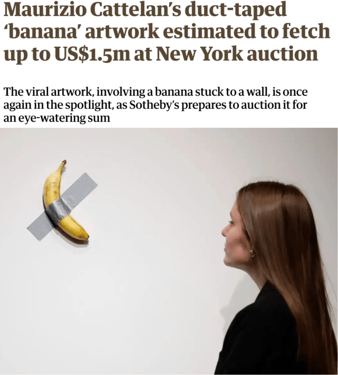 我们在当代社交媒体上更熟悉的卡特兰作品,没错,那根著名的天价香蕉,是一脉相承的理念。