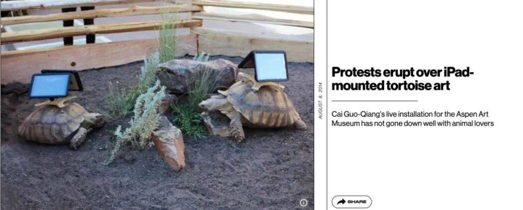 2013年,蔡国强在美国阿斯彭艺术博物馆的作品《移动鬼城》中,将iPad粘在苏卡达陆龟的龟背上,播放当地的“鬼城”影像。此举遭到大量动物保护和环保组织的强烈抗议。