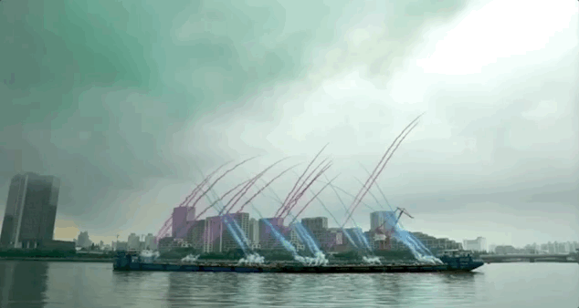 作品名叫《九级浪》,在黄浦江边,最繁华的位置,进行一次白日焰火,全长十分钟,爆炸声极大,浓烟滚滚,搞得上海老百姓们都以为出什么大事了,从现场的效果看,PM2.5爆表了。