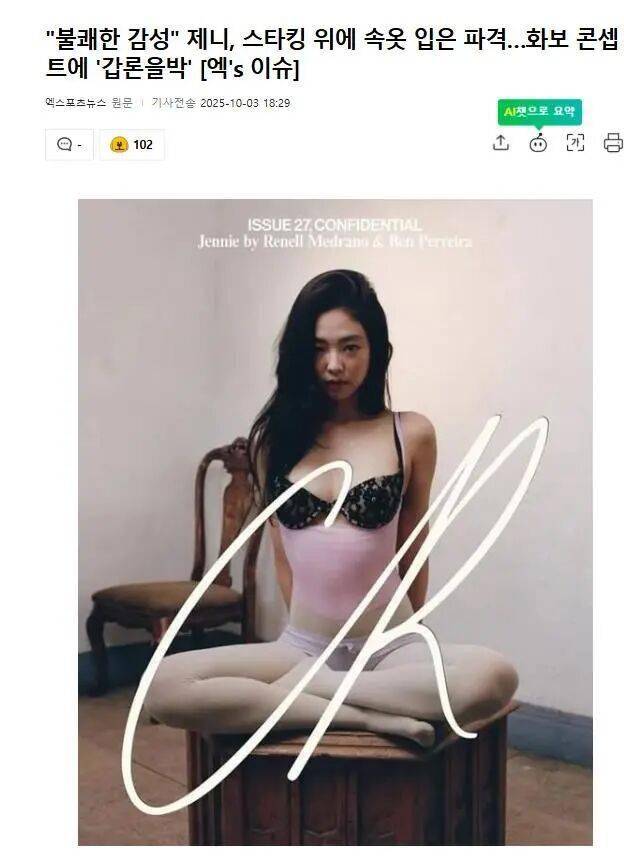 BLACKPINK成员Jennie又一次以破格造型站上风口浪尖——这次她直接把丝袜穿在了内衣外面,让韩国网友炸锅质问:“这到底是什么概念?”