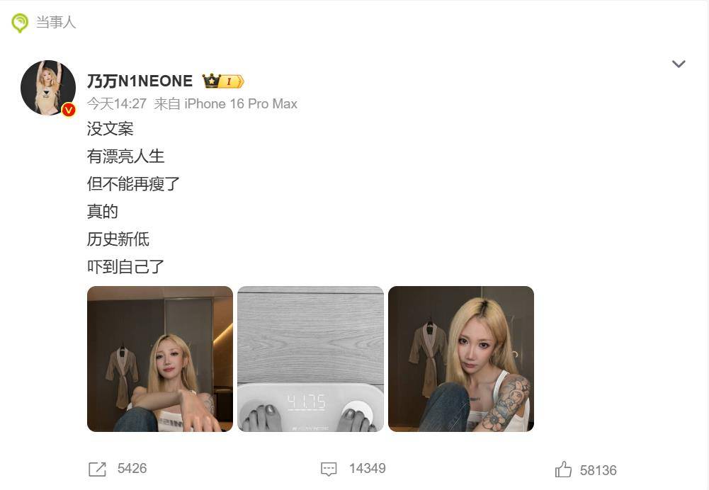 10月4日,歌手乃万在微博晒出一张体重秤照片——数字赫然停在41.75公斤(约83.5斤),配文“历史新低,吓到自己了”。她特别强调“不能再瘦了”,却在文中矛盾地写下“有漂亮人生”,仿佛在瘦削与美丽之间划上等号。这条微博瞬间引发网友们的关注。