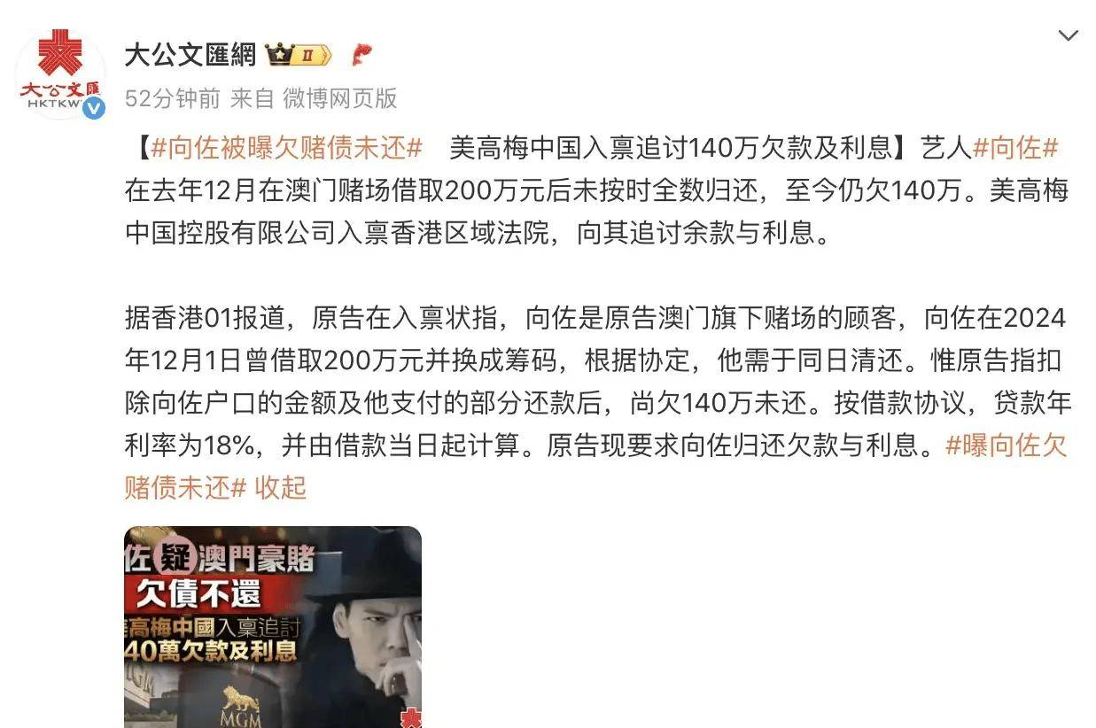 当时据港媒报道,向佐在澳门旗下赌场于2024年12月1日凭借200万元兑换筹码。