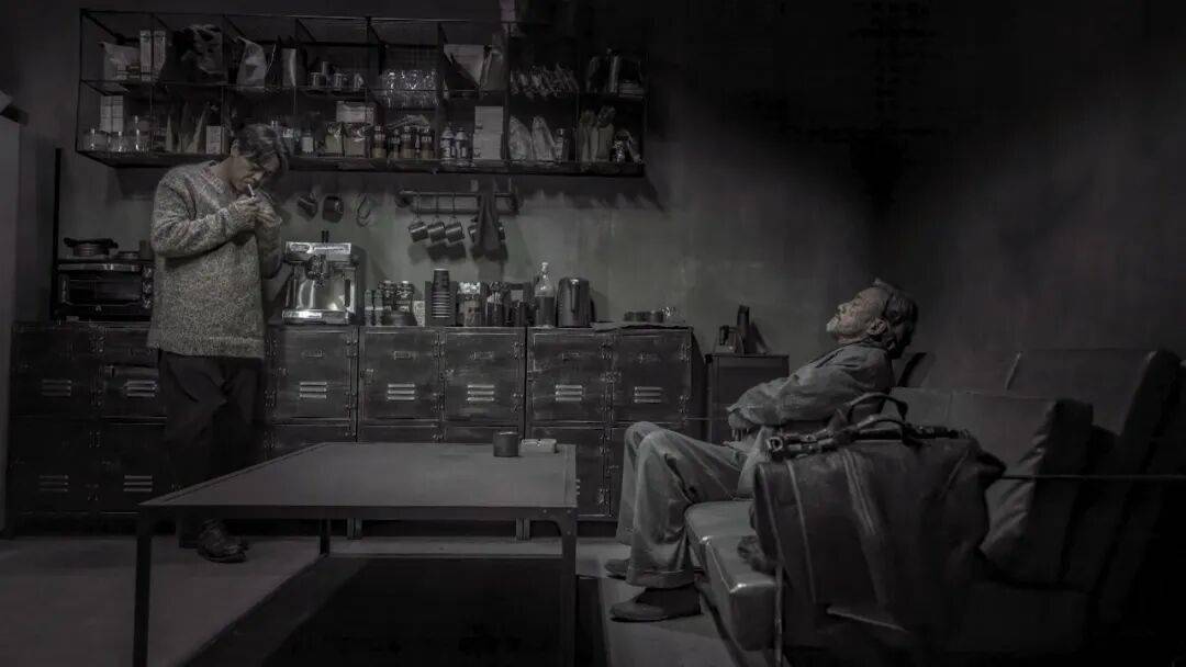 在视觉层面上,影片以黑、灰、白三色营造出黯淡的工业风视觉风格,着力将故事层面的末世感渗入到视觉表达中,同时人物的穿衣风格也呼应这一氛围,多以深色西装和风衣示人,整体呈现出冷峻、压抑且高度统一的视觉张力。