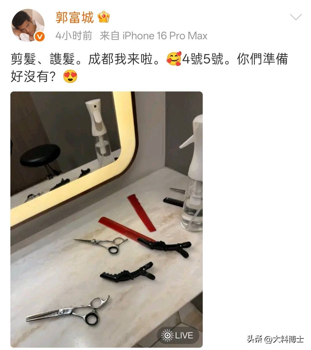 此前,郭富城通过微博发布了自己的工作行程,他写道:成都我来了,4号5号,你们准备好了吗?