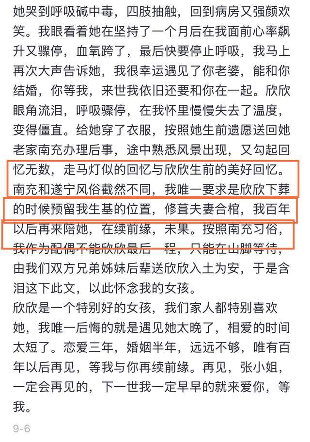由于蒋鹏和张欣来自不同的城市,所以丧葬礼仪也不同。按照张欣的遗愿,蒋鹏将其送回南充老家安葬,而他唯一的要求便是在妻子下葬之后为其留生基的位置,修葺夫妻合棺,但却遭到了对方父母的拒绝。