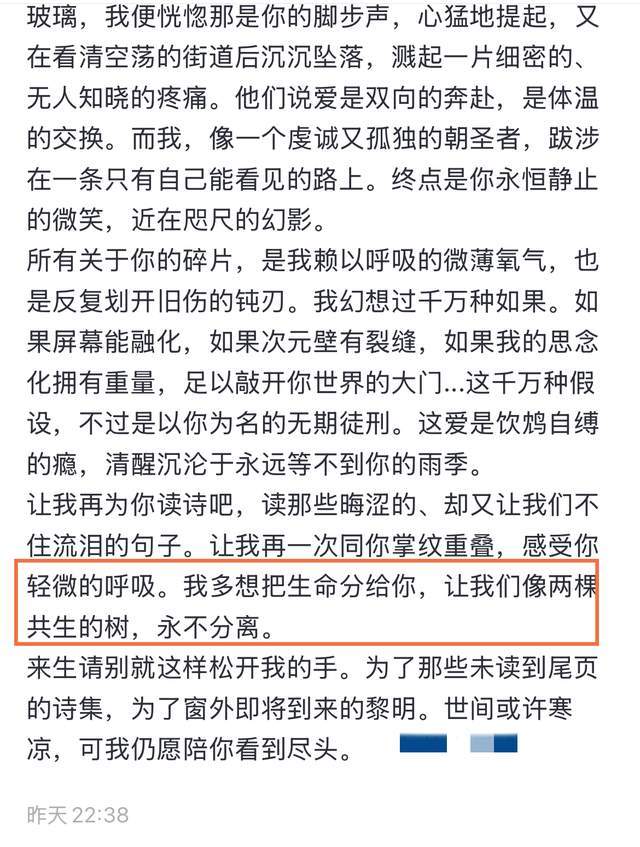 “我多想把生命分给你,让我们像两棵共生的树,永不分离”。