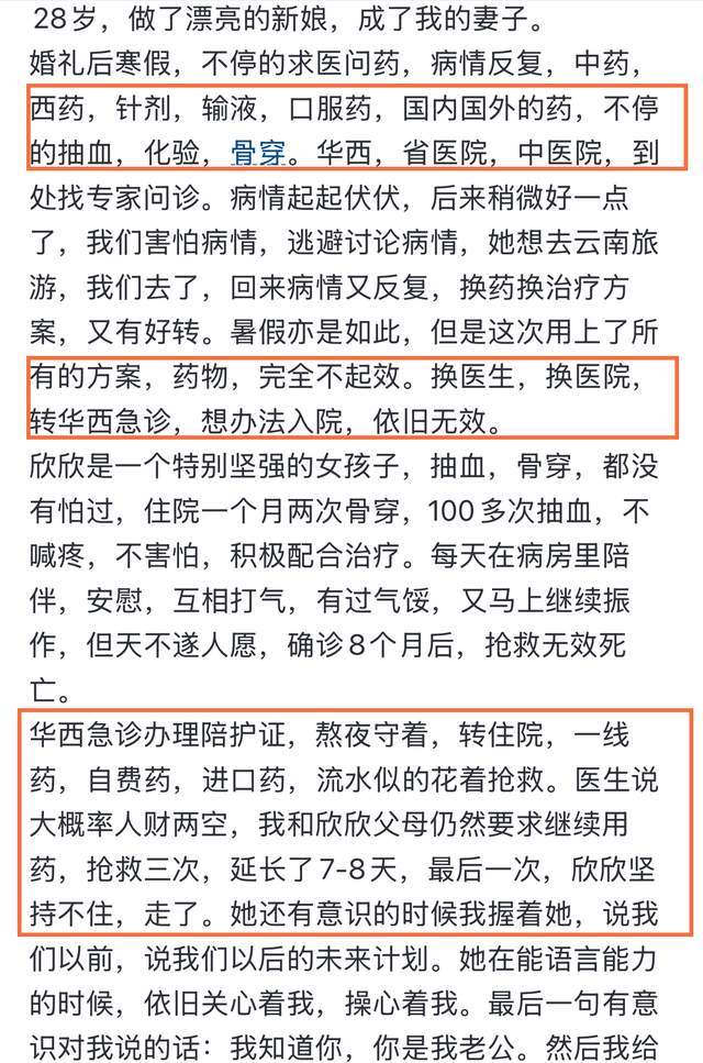 婚礼结束后,蒋鹏便带着张欣开启了寻医问药,从省医院到中医院再到所谓的“偏方”,100多次的抽血,1个月两次的骨穿,最终也没有能挽留住妻子的生命。