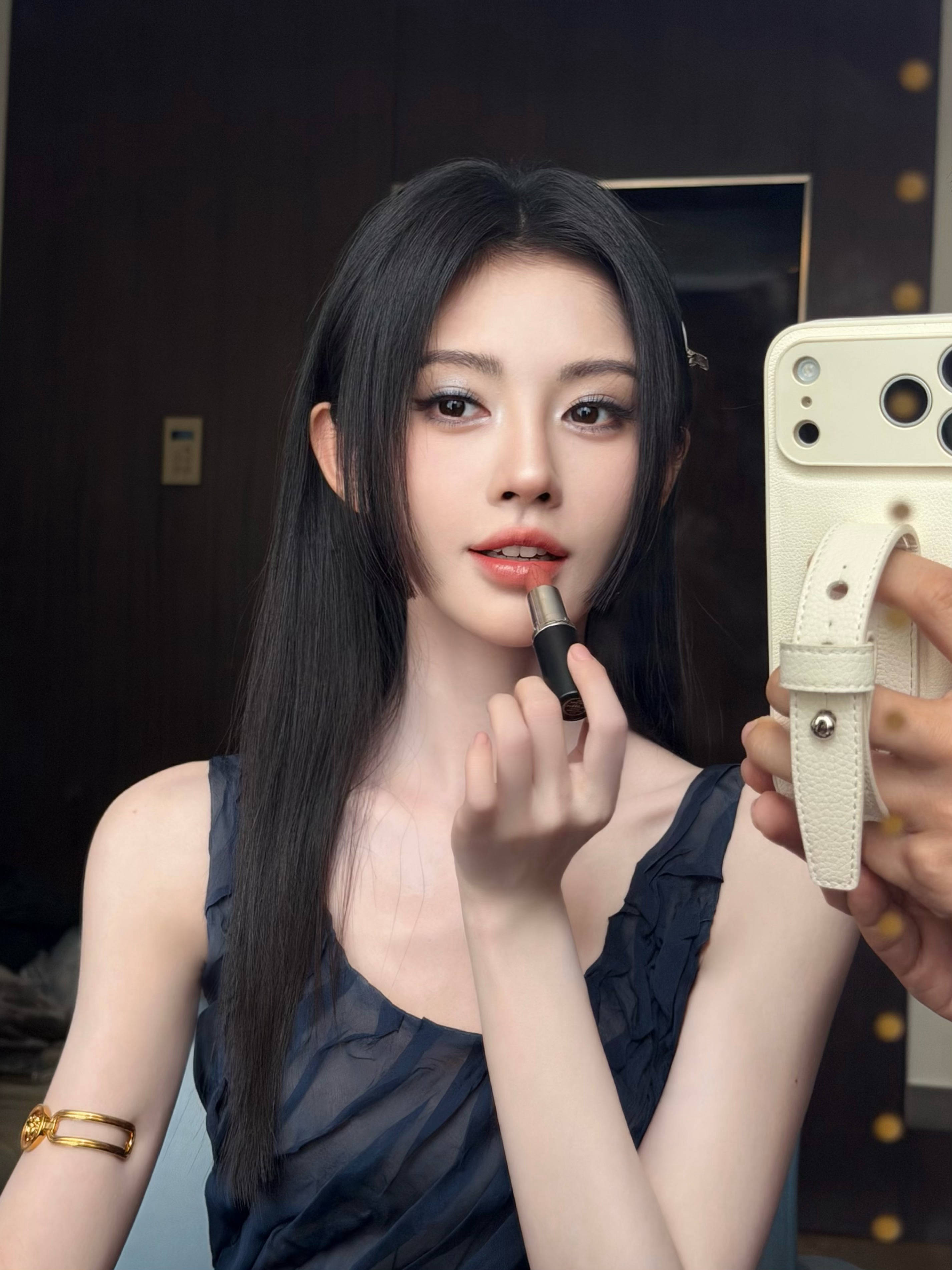 鞠婧祎对镜涂口红表情俏皮。