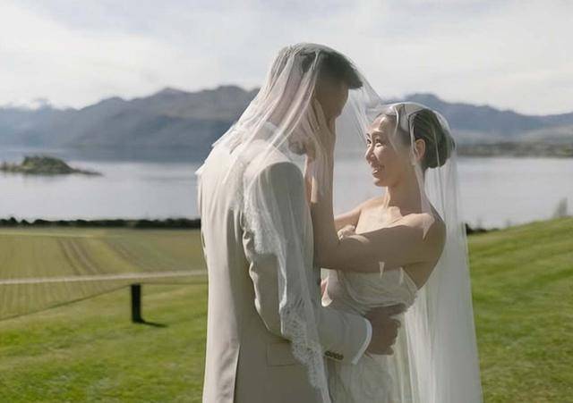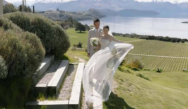 照片中,有草坪、有天空、有蛋糕、有雪山、还有湖水,几张婚纱照都拍摄得相当唯美,获得了大量好评。