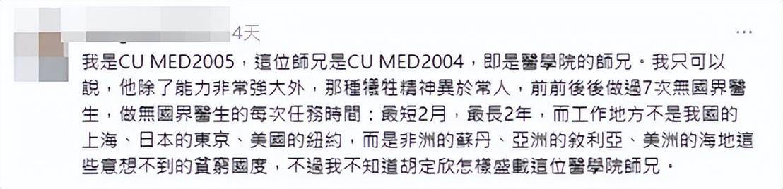 爆料者对于陈健华称赞不已,但在谈及陈健华与胡定欣的恋情时,他却表示不知道胡定欣,要如何承载这位医学院师兄。