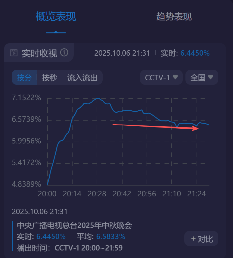对比去年央视中秋晚会的收视率,收视率明显有大幅提升。去年央视中秋晚会的最高峰值5.9,平均收视率5.6,而今年平均峰值是6.5,最高点破7。