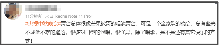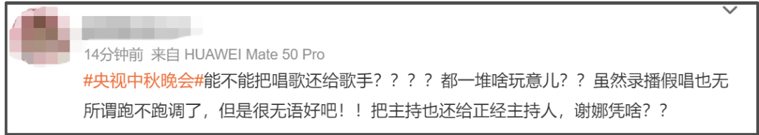 今年央视秋晚邀请了大量演员出演,比如蒋勤勤、于适、宋佳等等,他们都不是专业歌手,经过修音后的演唱质量也仅限于不跑调,歌声并不动听,对嘴都差强人意,让人听得难受。而且,各种大杂烩式的拼盘组合,也让人看得迷惑,并不像是合家欢的联欢晚会。