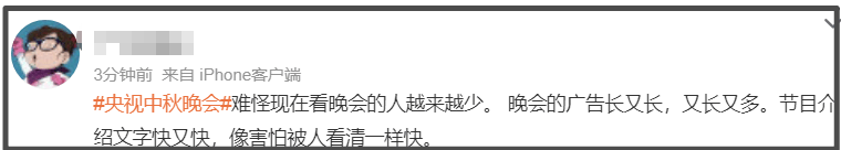 还有广告的问题,今年秋晚的广告太多,完全影响了观众的观看体验,不仅有中插植入短片、主持人播报广告,还被镶嵌在舞美上,比如灯笼、小桥、阁楼等等,而且每个广告的长度快赶上一个节目的长度,让人难以忍受。
