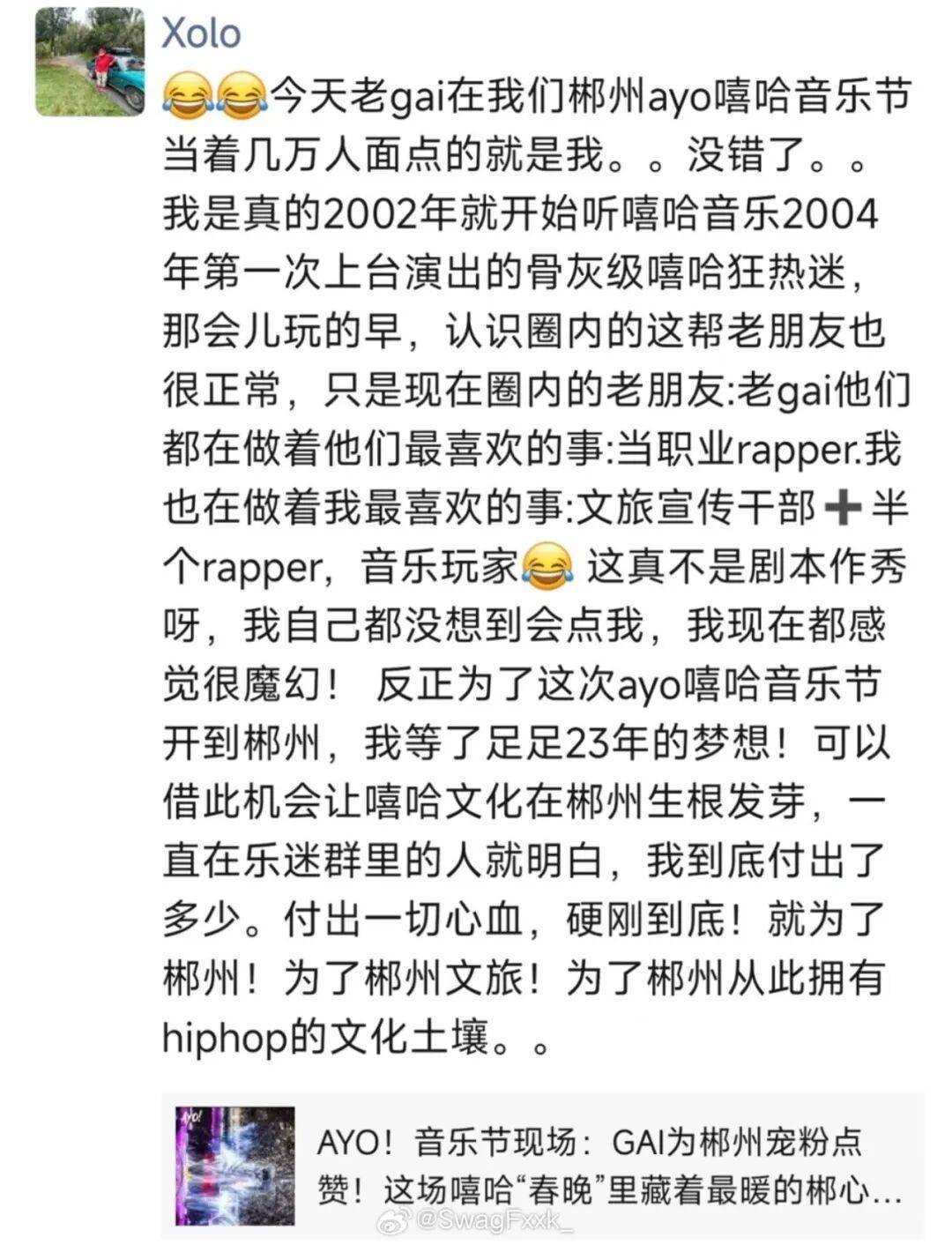 反正为了这次嘻哈音乐节开到郴州,我等了足足23年的梦想!”