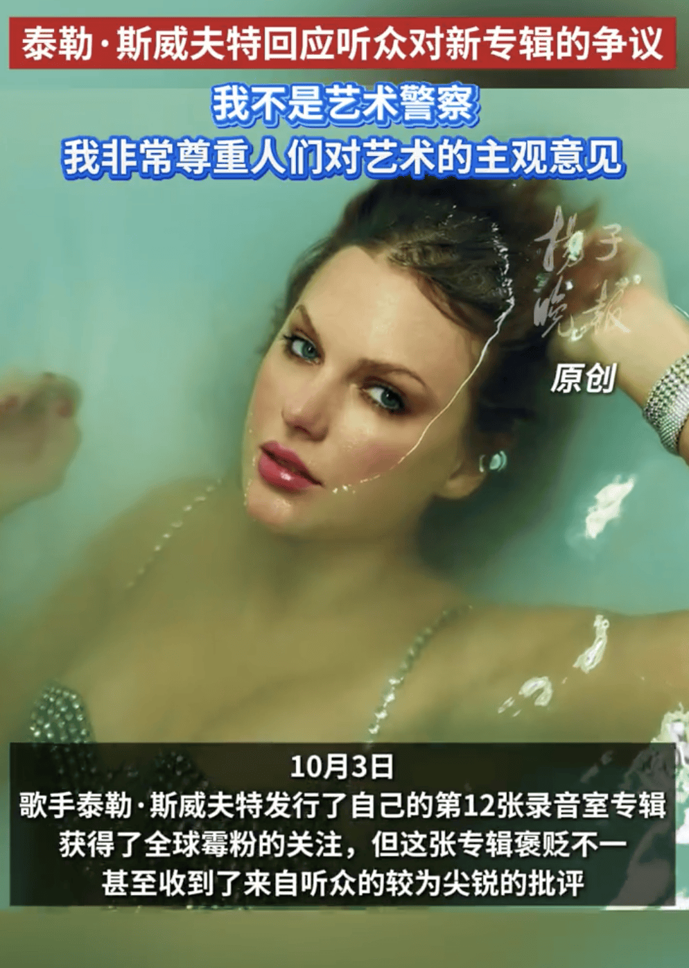 10月3日,歌手泰勒·斯威夫特发行了自己的第12张录音室专辑,获得了全球霉粉的关注,但这张专辑褒贬不一,甚至收到了来自听众的较为尖锐的批评。10月7日,泰勒在音乐综艺节目《赞恩・洛秀》上回应了听众对于该专辑褒贬不一的评价。