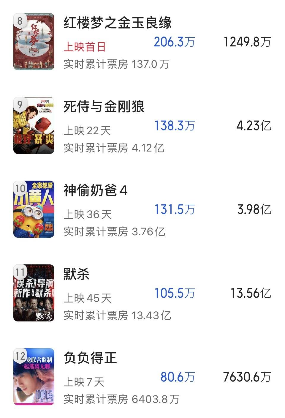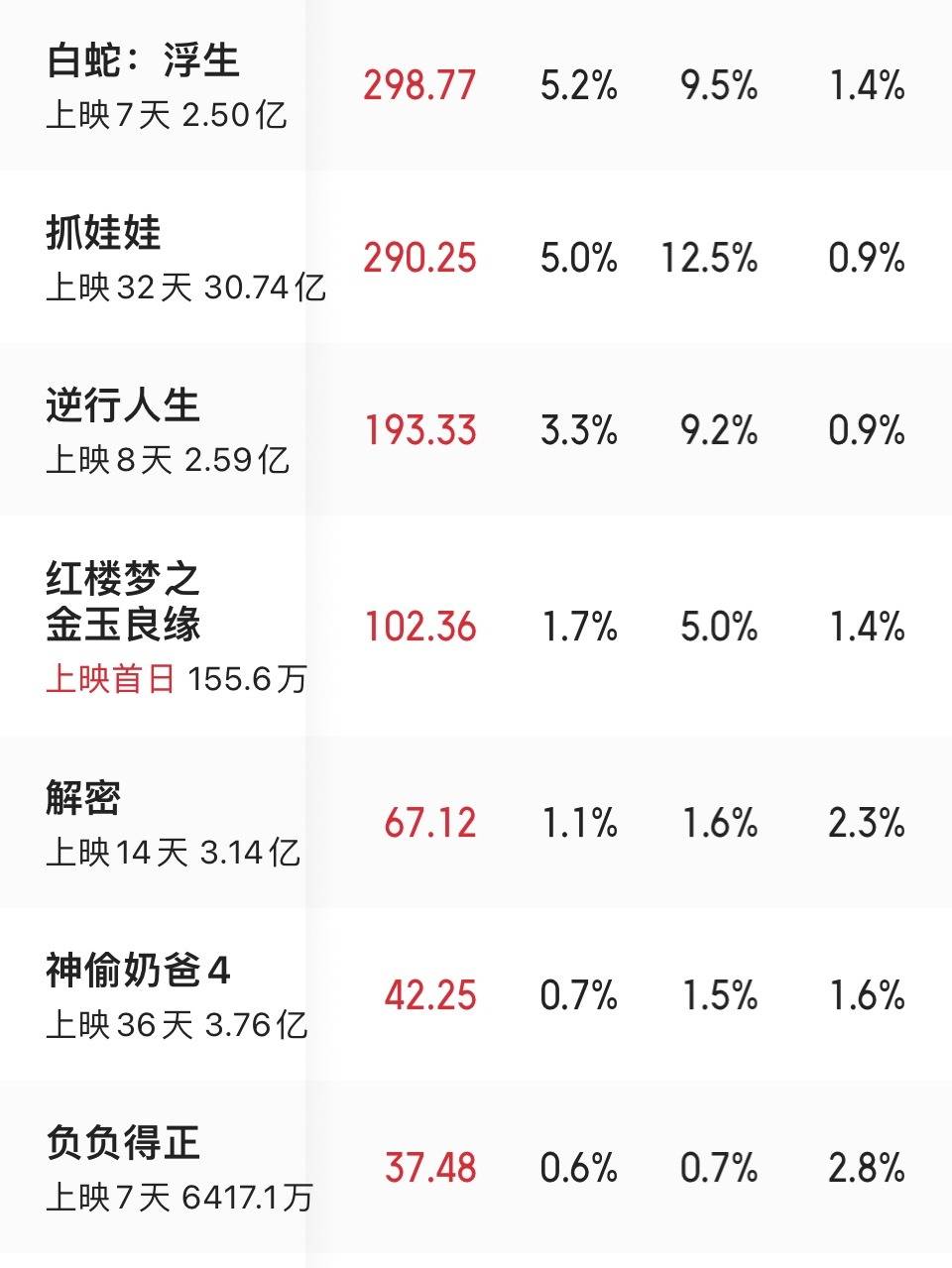 新的一周,随着《重生》《异形:夺命舰》《红楼梦之金玉良缘》《小孩不笨3》《名侦探柯南:百万美元的五棱星》等五部新片的上映,包括《抓娃娃》在内的已经上映多日的影片纷纷被调低了排片率,这其中降幅最大的可能要算是《负负得正》了。目前,《负负得正》的排片率只有可怜的0.7%。而随着排片率降至不足1%,《负负得正》票房的增加空间也被大大压缩了。截止目前,《负负得正》的累计票房达到了6500万,最终票房或止步于7000万,或者7000万多一点。