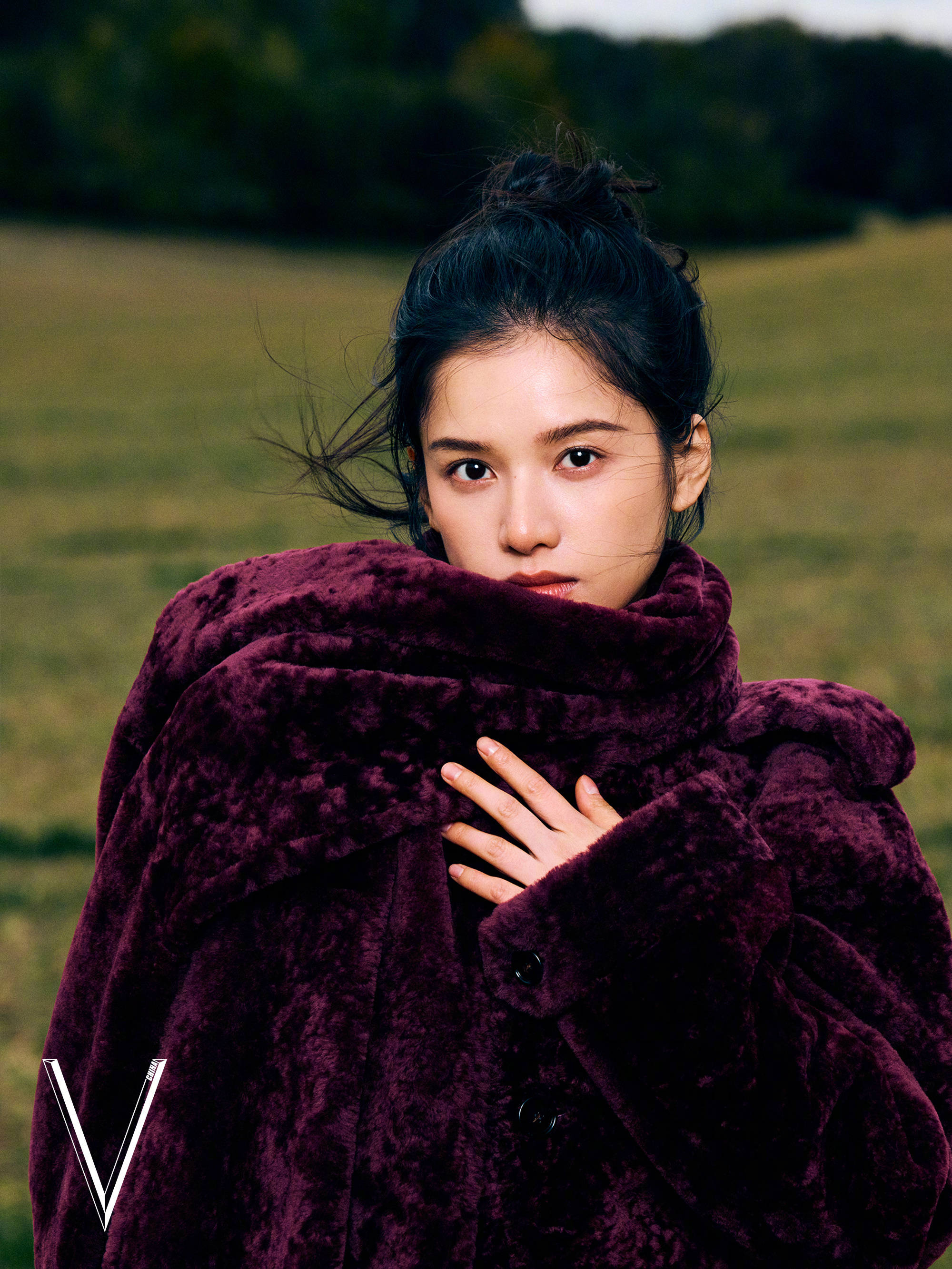 张婧仪身穿酒红色毛绒外套,气质温婉。