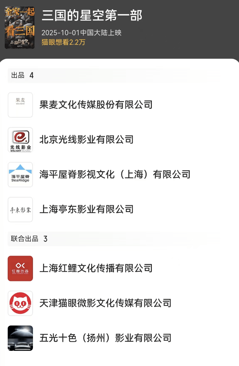 前面说了排在前两位的出品方,果麦出文学版权,光线负责电影制作,这样的分工显而易见。《三国的星空》导演袁原,是红鲤动画的创始人之一,而红鲤动画是光线的子公司,专注于电影全流程制作,业务涵盖动画电影、CG短片和VR影视开发等等。