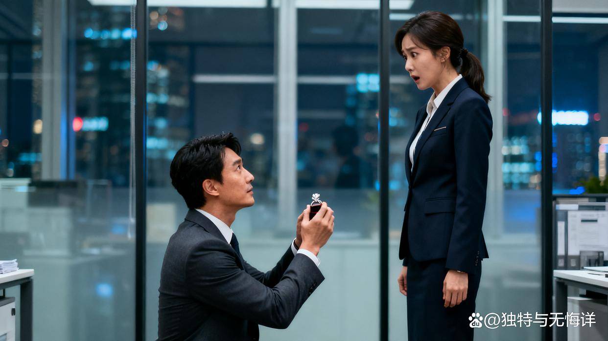 周辰单膝跪地,仰着头,脸上是她熟悉的、充满爱意的表情——曾经只属于她。他手里举着的丝绒戒指盒里,那枚“The One”系列钻戒,在昏暗的灯光下折射出冰冷而璀璨的光芒。