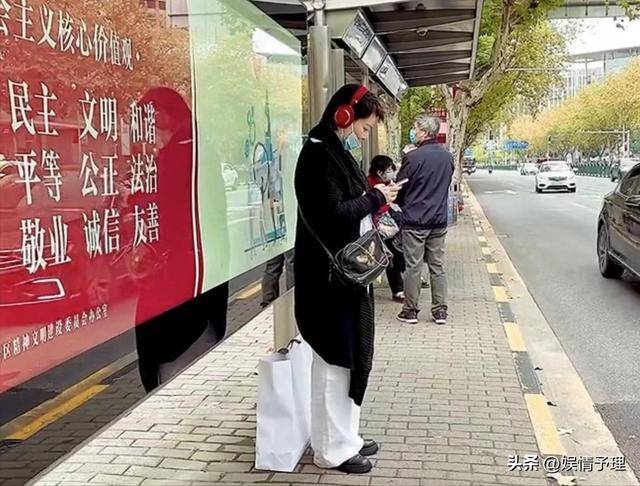 有人在公交车站拍到袁立穿着大衣、素面朝天,随手拎着个大购物袋在等公交;