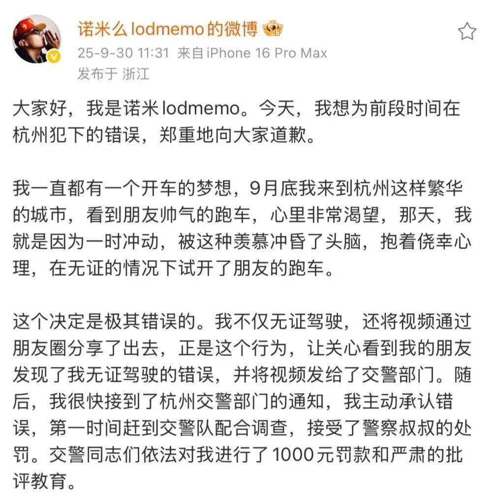 还记得在国庆假期前,曾火爆全网的诺米被曝无证驾驶,不仅被罚1000元,也引发了巨大争议!