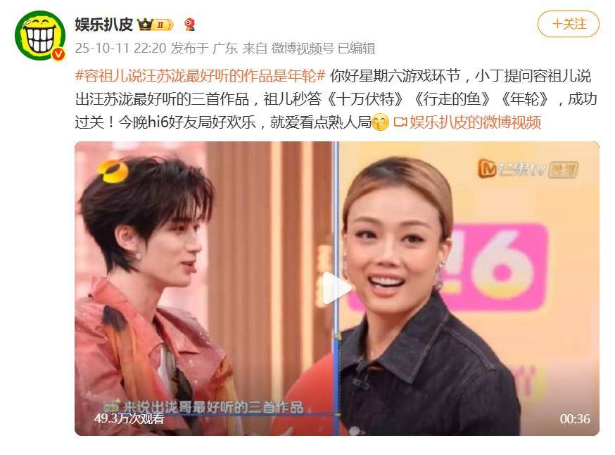 在最新一期《你好星期六》的游戏环节中,容祖儿用一句坚定的“《年轮》”,让全场瞬间沸腾。当何炅以“大雨”梗暗示她提及两人合作的《就让这大雨全都落下》时,她毫不犹豫地跳过这首自己原唱的爆款,选择了汪苏泷八年前为《花千骨》创作的OST《年轮》。这一举动被观众形容为“爽文剧情照进现实”,更在《年轮》近期版权争议的背景下,成了对原创者最直接的声援。
