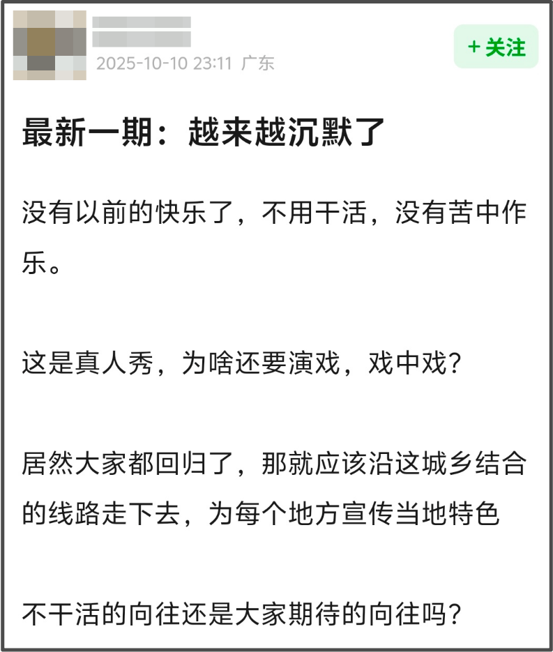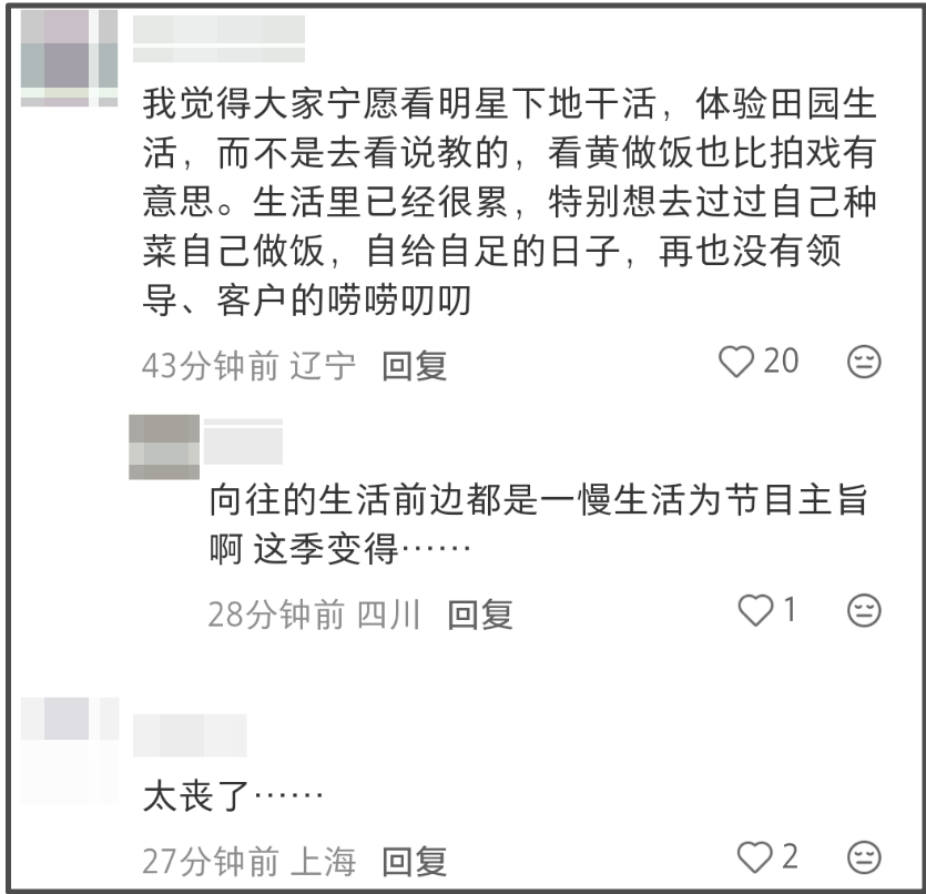 另外,节目中频繁传达嘉宾健康状况不佳的情绪也让观众愈加难以产生共鸣。黄磊需要吃药,彭昱畅减肥减到几乎没力气,大家强行支撑着继续录制节目,甚至连做个简单的工作都显得力不从心。观众不禁发问,难道《向往的生活》现在是变成了一个“卖惨”的节目?这真的是大家所期待的节目内容吗?如果节目拍不出原本的味道,不如就此收场,免得让观众失望。