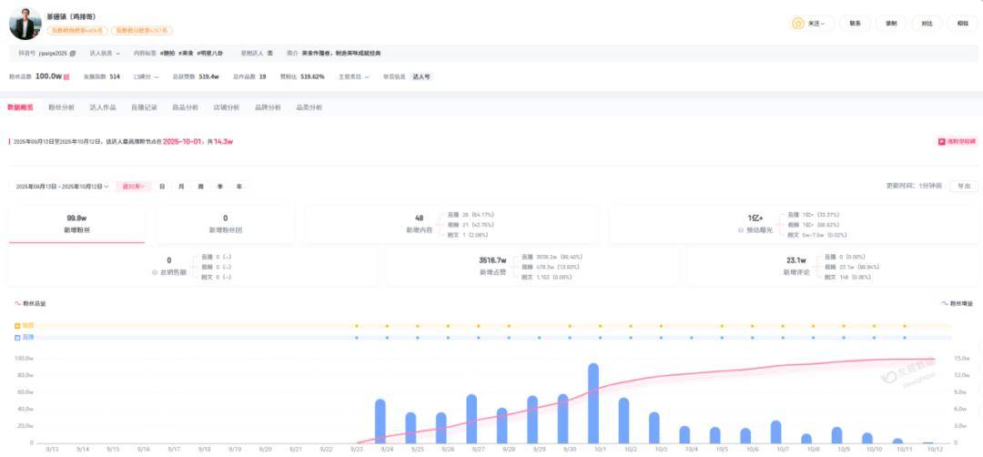 国庆首日是“鸡排哥”涨粉最多的一天。10月1日当天,“鸡排哥”发布了一条视频作品,开启了两场直播,单日涨粉数达到14.3万。