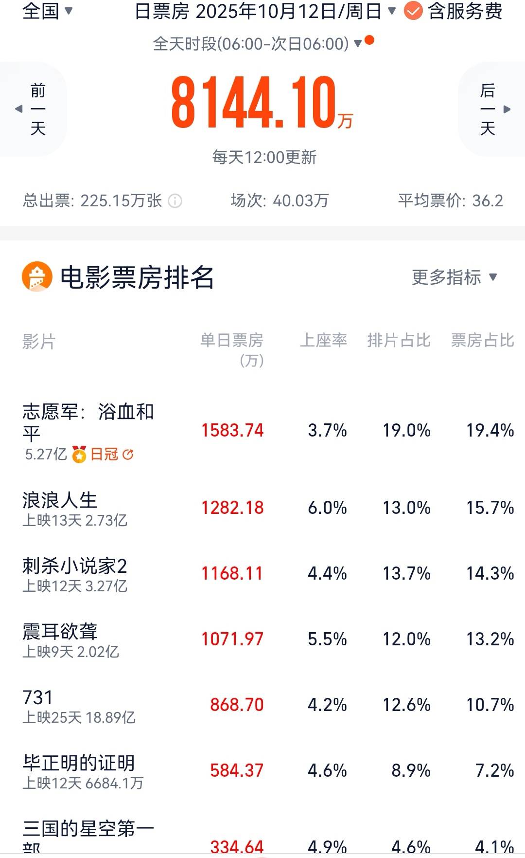 《志愿军:浴血和平》《浪浪人生》《刺杀小说家2》单日票房各1584万元、1282万元、1168万元,排在前三。