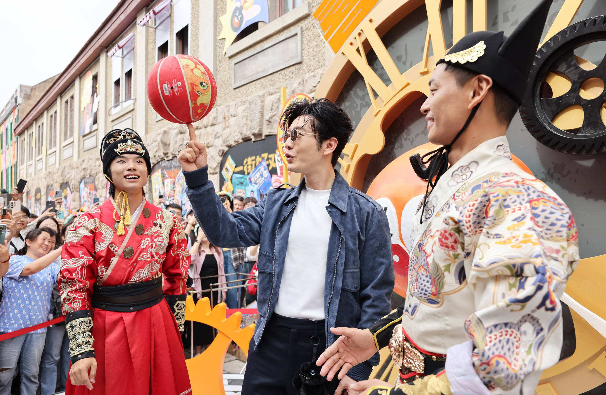 黄晓明灵动的运球动作与喜剧节的轻松氛围完美契合。