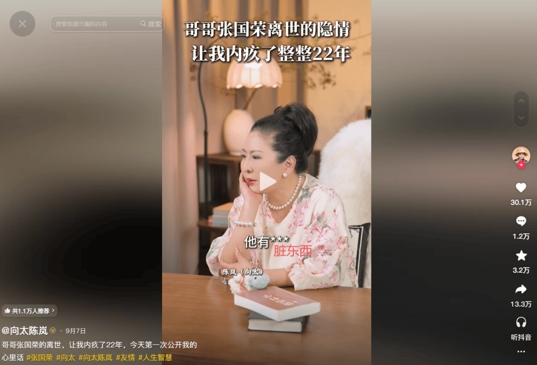 像是向太,就在视频中讲了梅艳芳曾经被黑帮威胁和张国荣自杀的事情。