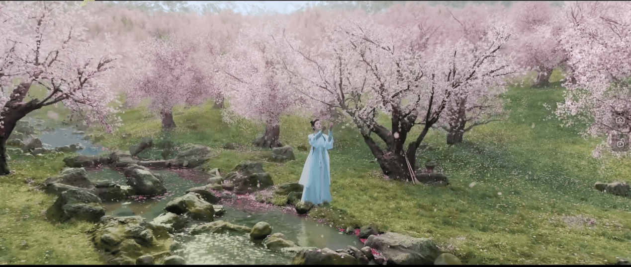 这样的美景,是剧组专程前往西藏林芝进行航拍,捕捉壮丽的桃花美景,提升了影片的视觉冲击力,也为传统故事注入现代气息。花瓣随风飘落的场景令人动容,充满诗意哀愁。