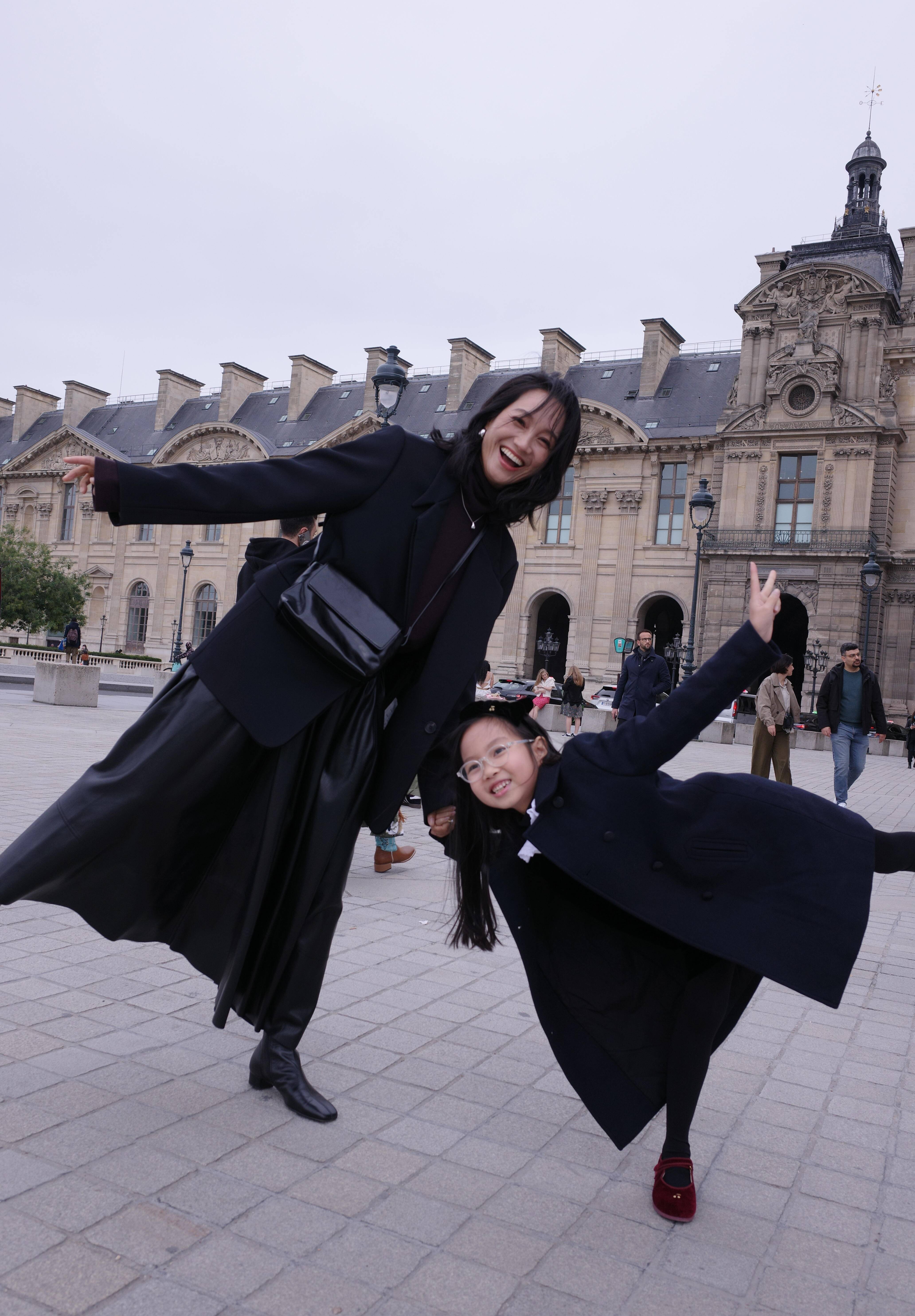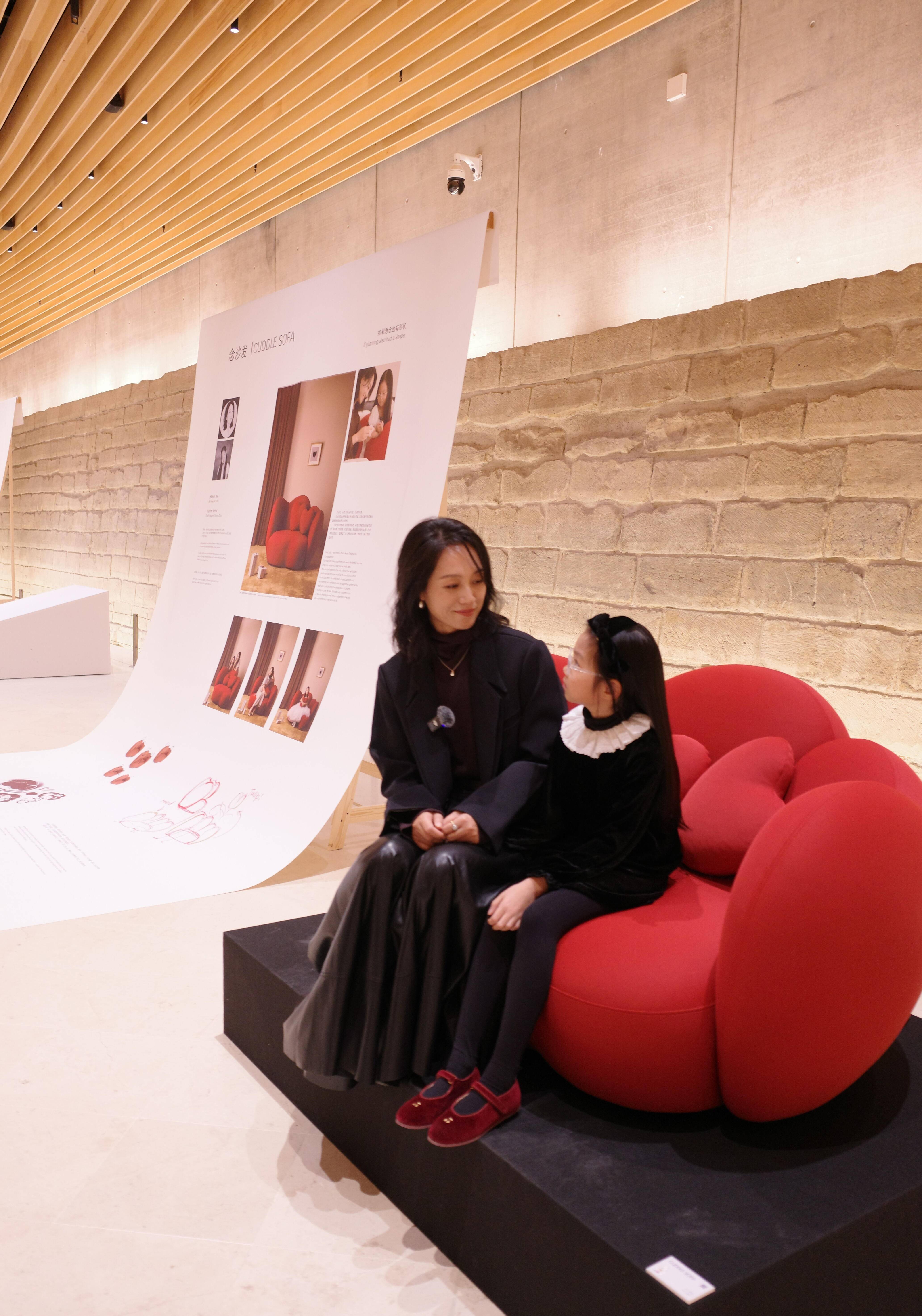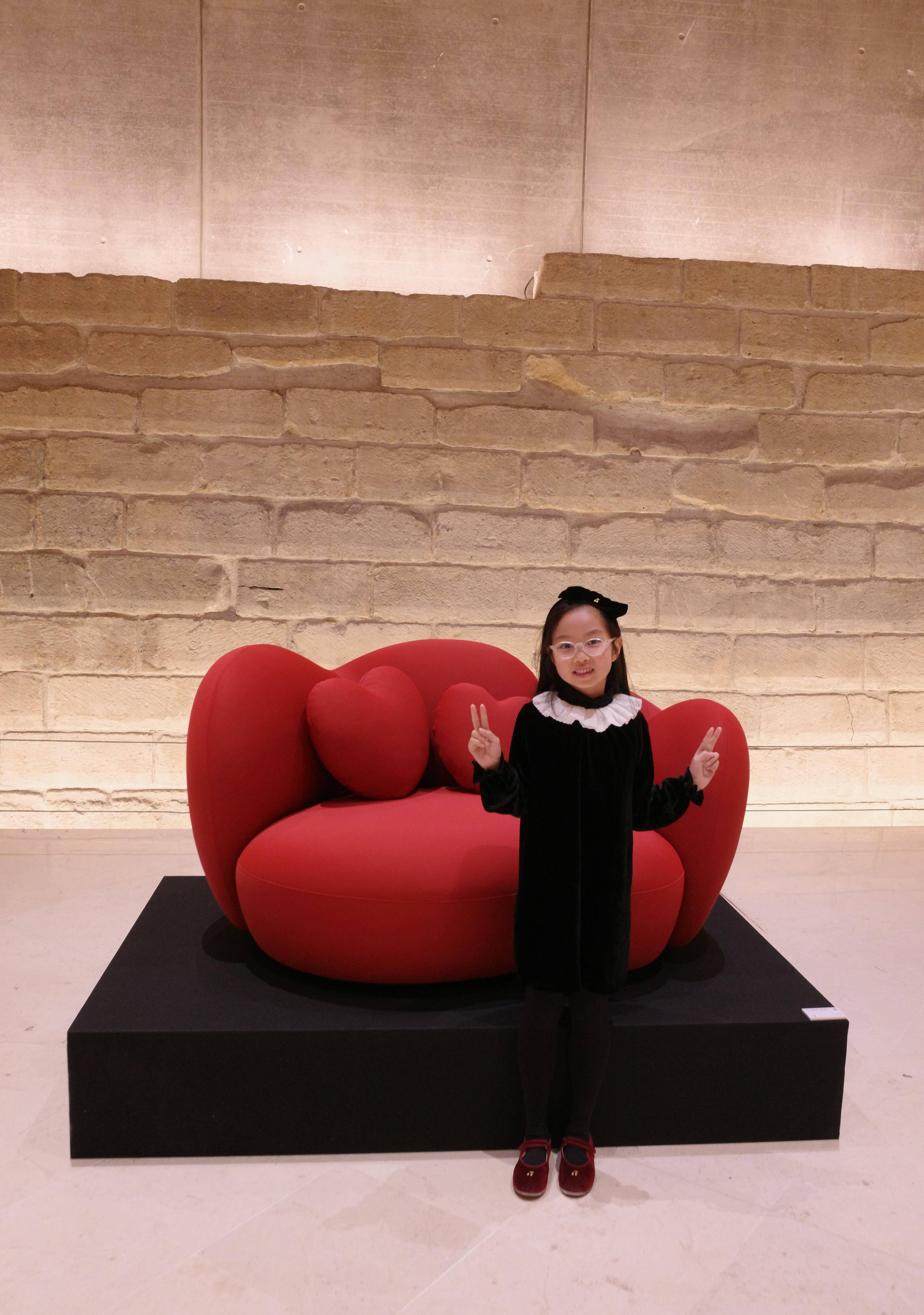 搜狐娱乐讯 10月14日,一组朱丹和女儿的照片流出。图中,朱丹女儿设计的沙发在卢浮宫展示,母女俩在展板前合影。