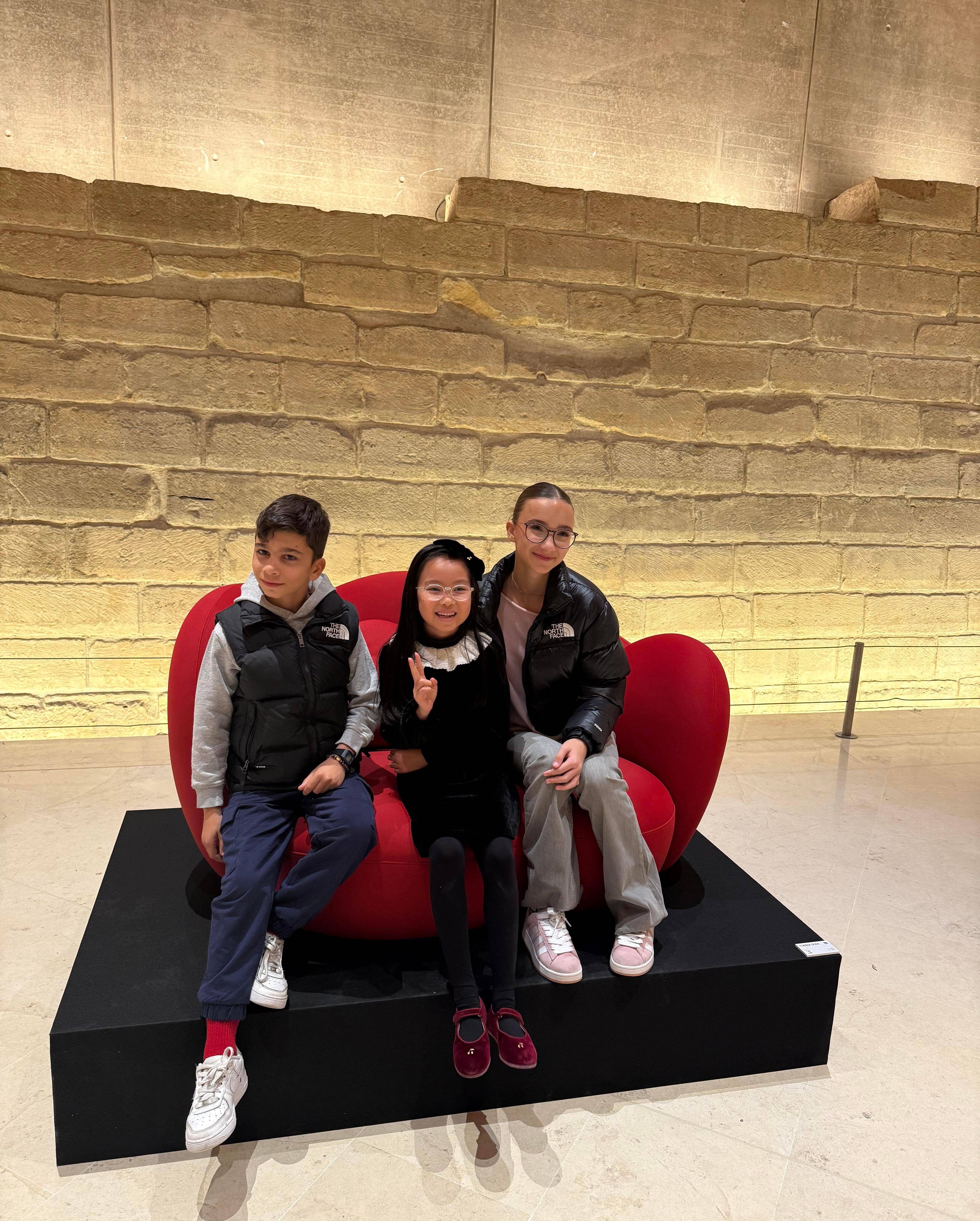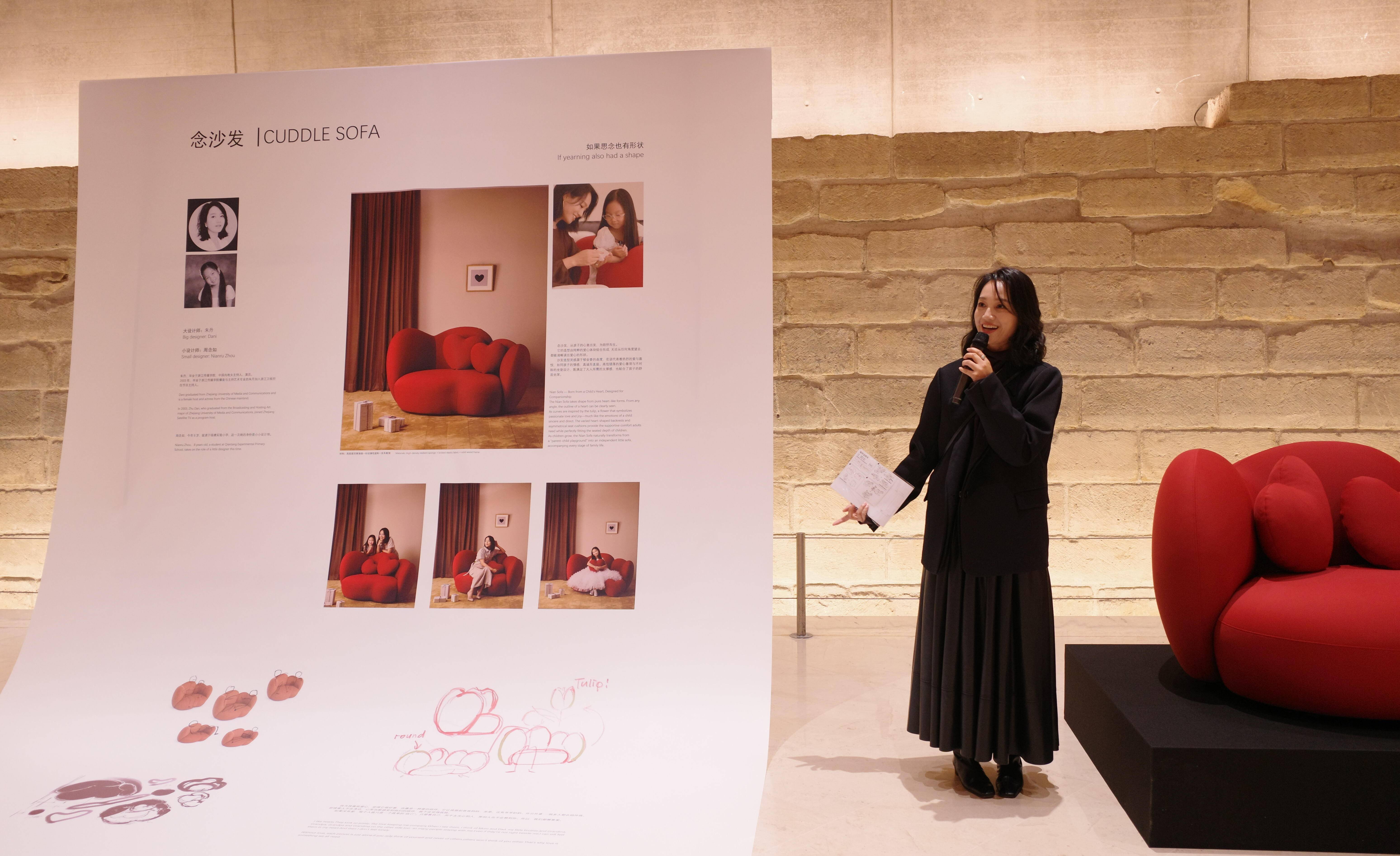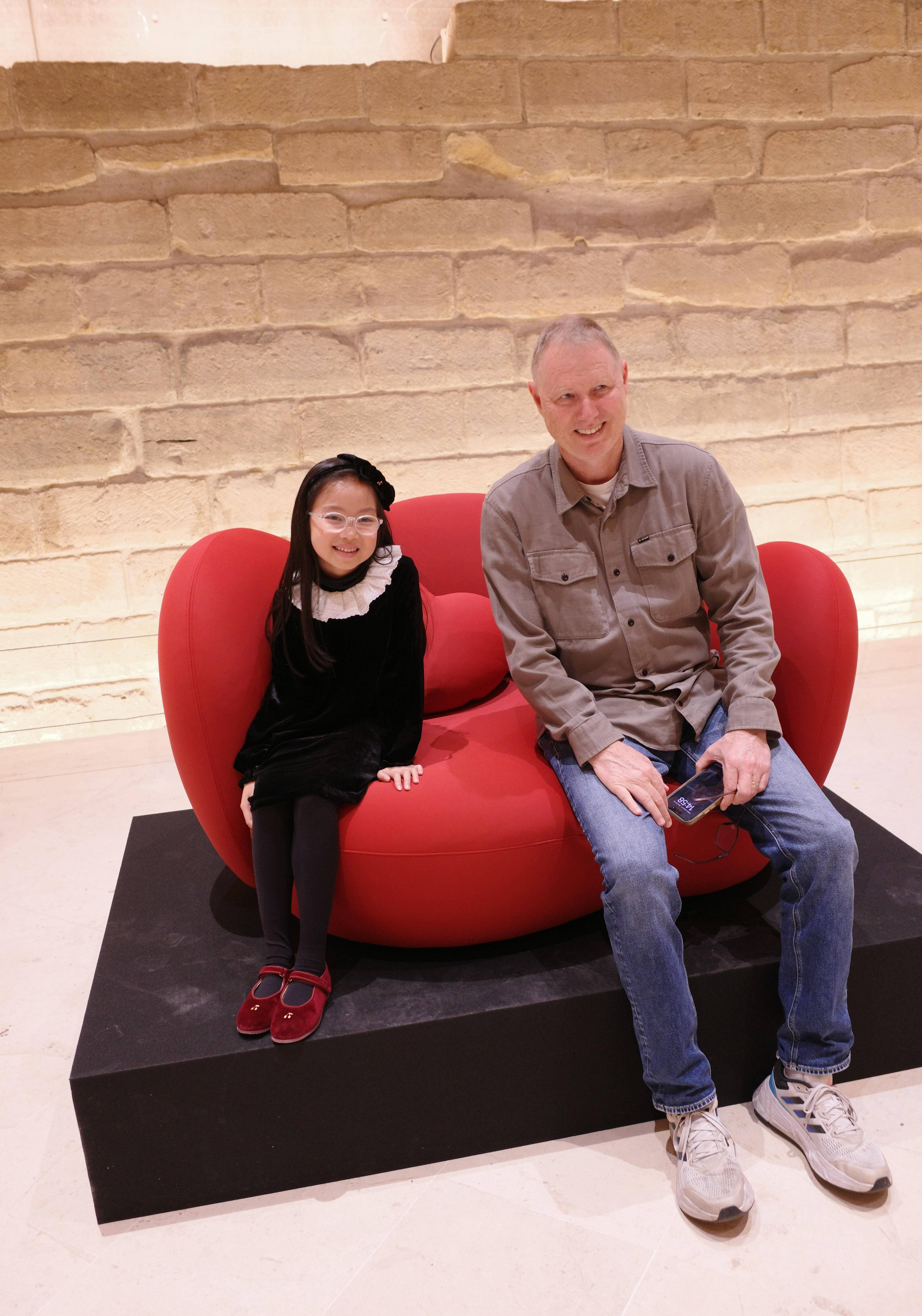 搜狐娱乐讯 10月14日,一组朱丹和女儿的照片流出。图中,朱丹女儿设计的沙发在卢浮宫展示,母女俩在展板前合影。