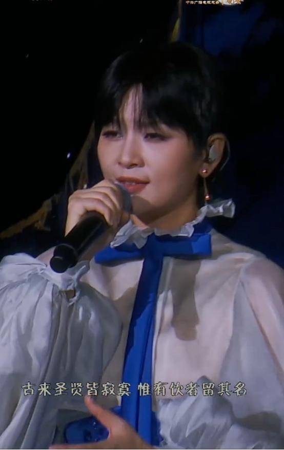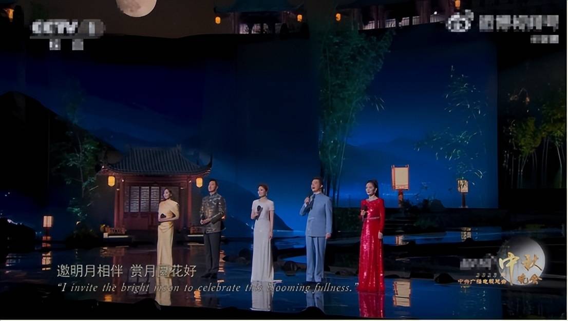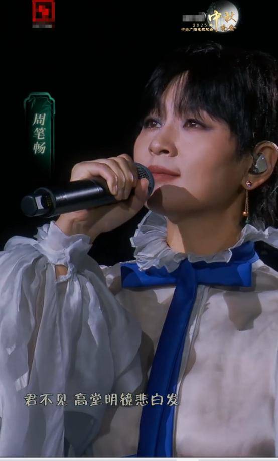 几个角度的镜头扫过,都显得周笔畅疲惫、老气,没什么精气神。另外,她的礼服也不符合中秋的氛围,蓝色配白色,色调过冷,款式也太老了。