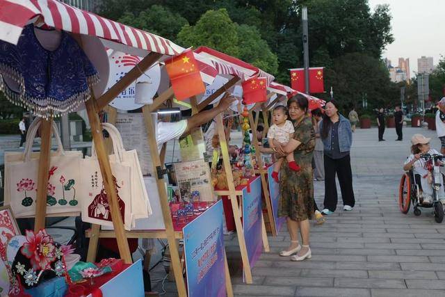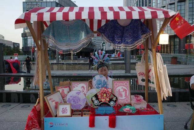 开幕舞台旁的非遗手工市集,是本届街艺节的又一亮点。丝帛剪纸创始人尤彩侠从帽子、汉服再到手中的团扇,皆由丝帛剪纸装饰而成,“剪纸不仅能用纸张,亦可以用丝帛,可以用于各类生活场景,非常接地气。”摊位上摆放有披肩、胸针、头饰、团扇等,蝶类图案生动,常有小朋友驻足。