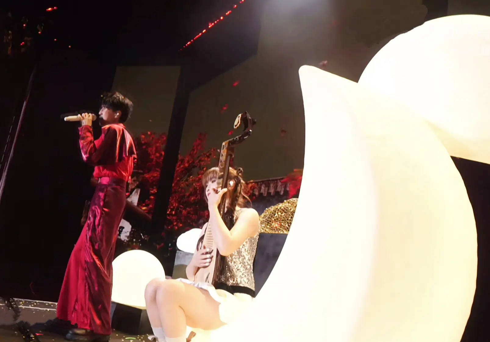 女儿抱着琵琶静静坐在舞台一侧,指尖拨动琴弦的瞬间,古典韵律缓缓流淌。