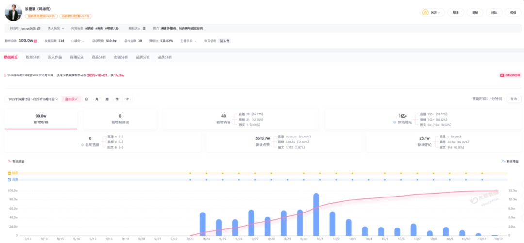 国庆首日是“鸡排哥”涨粉最多的一天。10月1日当天,“鸡排哥”发布了一条视频作品,开启了两场直播,单日涨粉数达到14.3万。