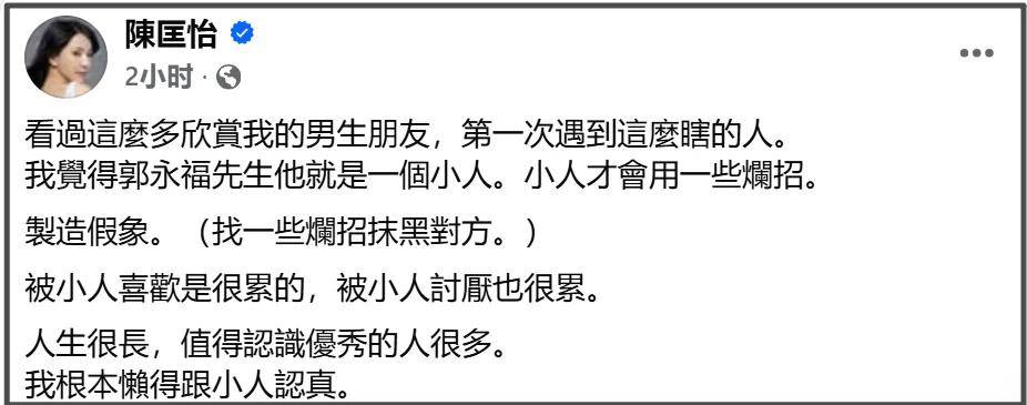 从时间线看,陈匡怡被爆料深夜给多位已婚学长发信息,还穿着薄纱睡裙约人见面,确实像是富商郭永福和黄学长的报复,毕竟前脚陈匡怡才跟对方闹矛盾,后脚就被曝出来一系列私密传闻,怎么看都觉得太巧了。