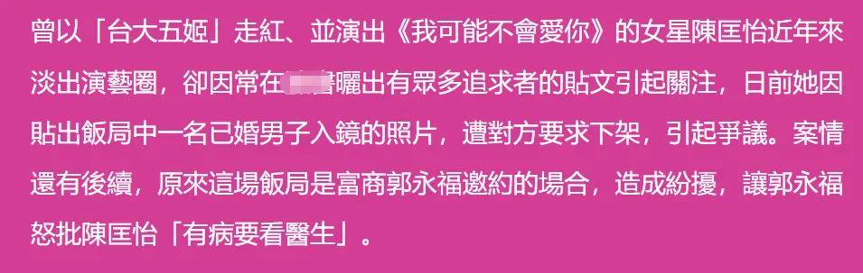 不过陈匡怡对演戏兴趣不大,早早就处于半退圈状态了,直到近年她经常因为争议行为被台媒报道,渐渐重回大众视野。