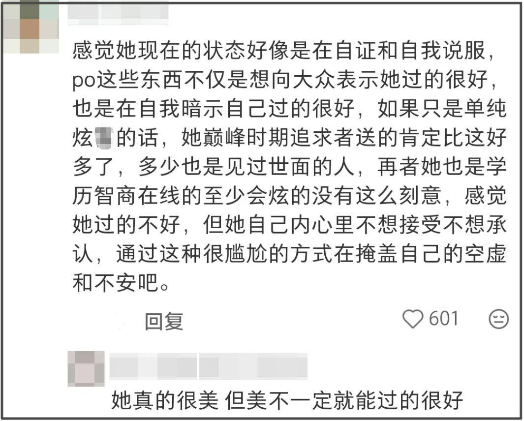 还记得2024年,陈匡怡被拍到当众换衣,被外界怀疑精神状态不佳,接下来一年时间,通过陈匡怡的社媒更新,越来越多人注意到她似乎陷入了自证和自我说服情绪——陈匡怡频繁晒出所谓追求者送给她的高价礼物,竭力对外证明自己过得非常好。