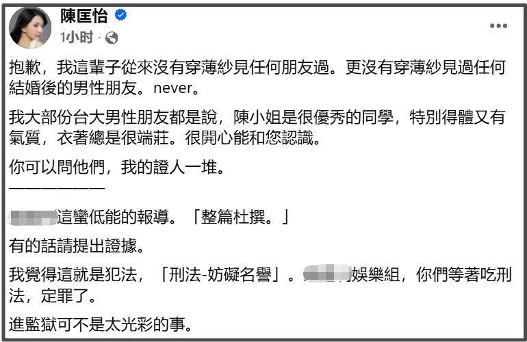 当然了,无论如何陈匡怡都不该被造谣,同时希望她能通过整件事,审视一下自身困境,37岁了,说大不大、说小不小的年纪,不要再沉沦下去了。