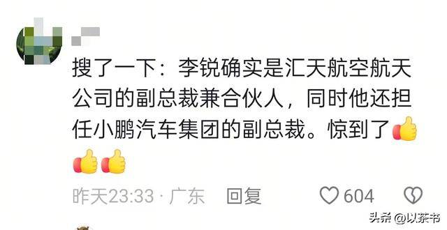 “搜了一下:李锐确实是汇天航空航天公司的副总裁兼合伙人,同时他还担任小鹏汽车集团的副总裁。惊到了”