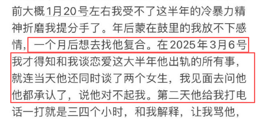 但经由女方调查核实,发现荣梓衫与至少三个女生存有暧昧关系,期间脖子上还有草莓印,每回查岗男方总是狡辩,后来直接把女方联系方式删除,女方忍受不了长达半年的冷暴力主动提分手,一个月后女方又主动提复合。到了今年3月,女方终于得知荣梓衫劈腿的实情,与她恋爱期间还谈了另外两个女朋友,荣梓衫承认并向女方道歉。