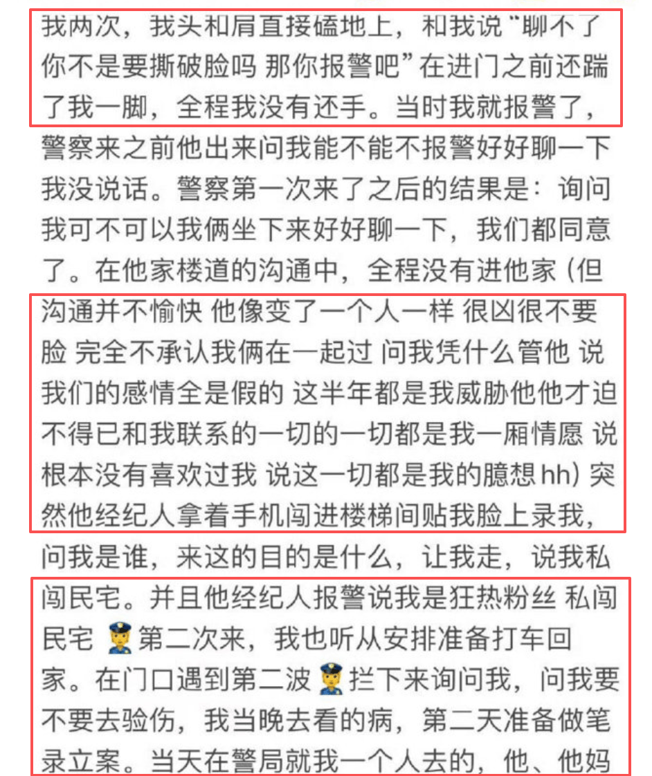 荣梓衫打人事件发生起因也是女方想要解决两人的问题,所以约见在男方家,刚一见面男方就把她拎起来摔倒在地,连摔两次,头和肩膀均受伤,还踹了她一脚,并放狠话“聊不了,你不是要撕破脸吗,报警吧”,女方并没有还手而是直接报警。荣梓衫到警局后还试图否认恋情,把女方打成疯狂粉丝,称自己被威胁。